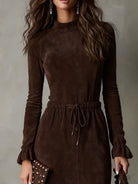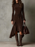 he Adalia Drawstring Midi Dress blends refined femininity with effortless comfort. Designed with a soft, suede-like finish and a beautifully sculpted silhouette, this piece adds instant sophistication to your wardrobe. The flattering drawstring waist, graceful long sleeves, and flowing asymmetrical hem create a look that is both polished and easy to wear — perfect for daytime outings, dinners, or elevated everyday style.