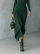 The Gabriella Turtleneck Midi Dress is designed for women who want a refined, modern look that feels comfortable and beautifully flattering. With its elegant high neckline, softly gathered wrap detailing, and graceful asymmetrical hem, it creates a silhouette that moves with ease while gently defining the waist. Whether you are heading to a dinner, an evening event, or a special gathering, Gabriella offers timeless sophistication with a confident, feminine finish.