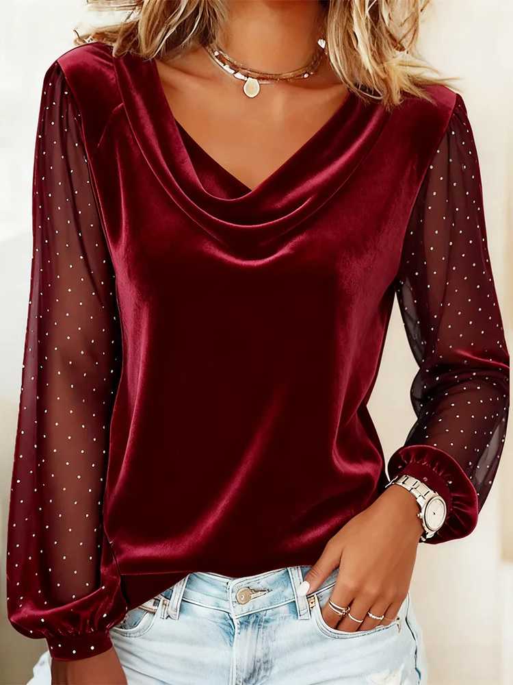 Light, airy sleeves offer elegant coverage while adding a delicate contrast to the smooth body of the blouse.